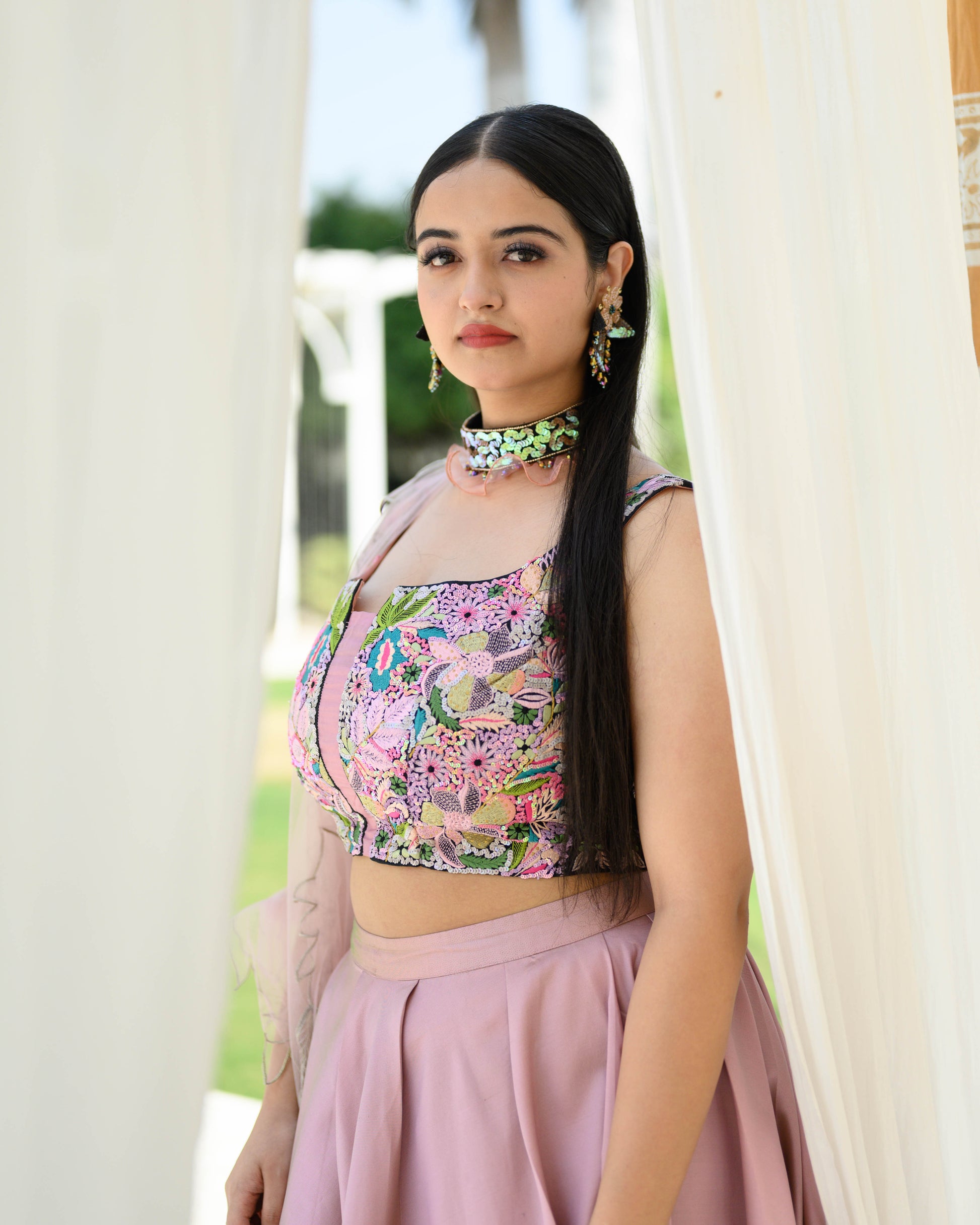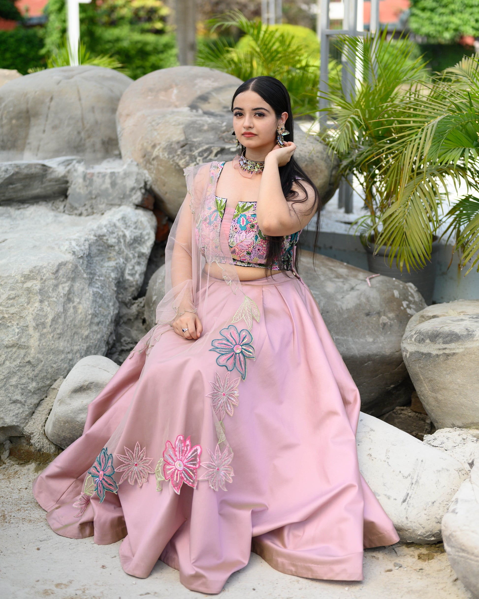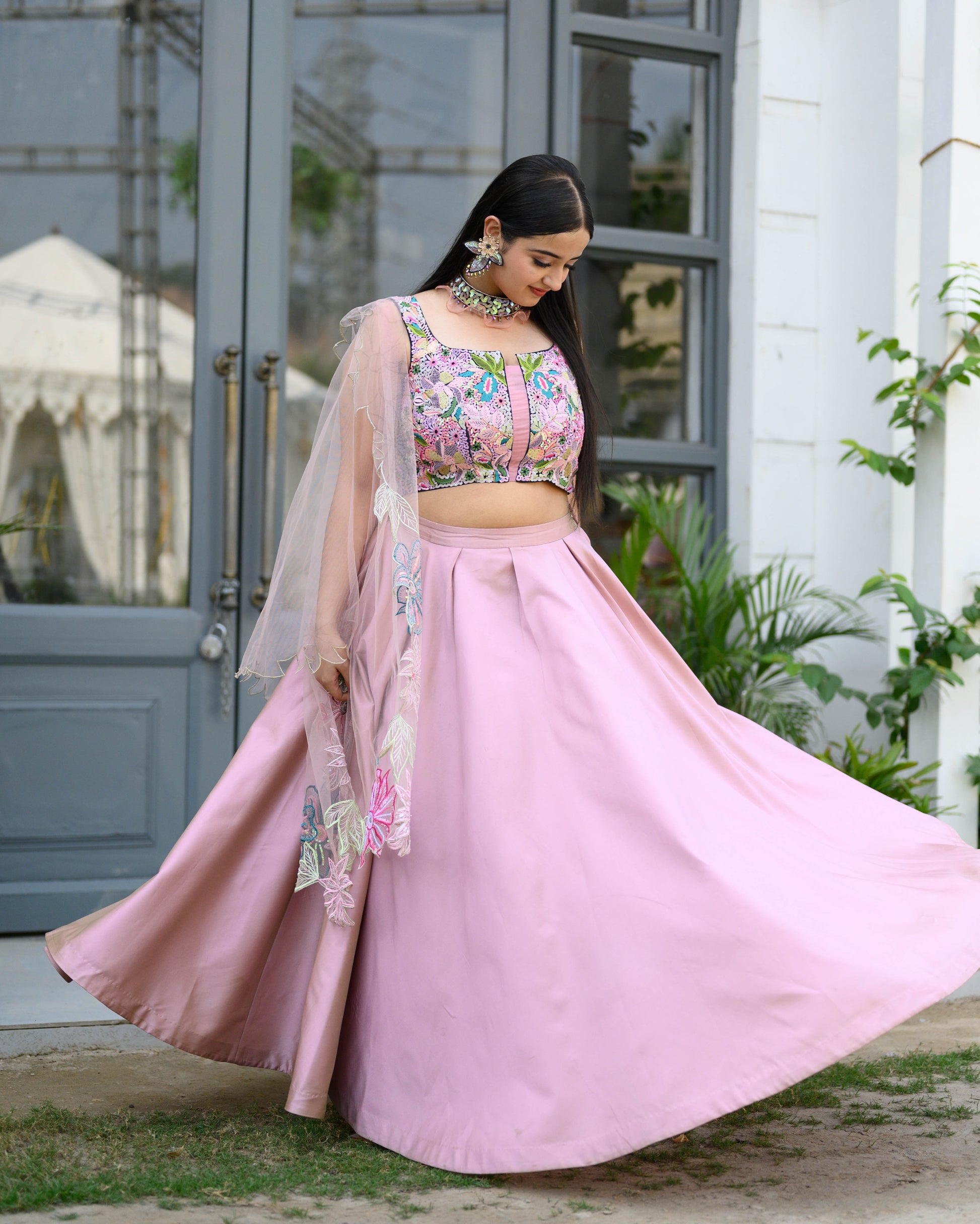 Beautifully crafted silk lehenga with intricate embroidery on blouse and dupatta is a perfect pick for the wedding season. The tulle of the skirt gives a ‘must do’ twirl vibe. Colour customisation is on request basis.